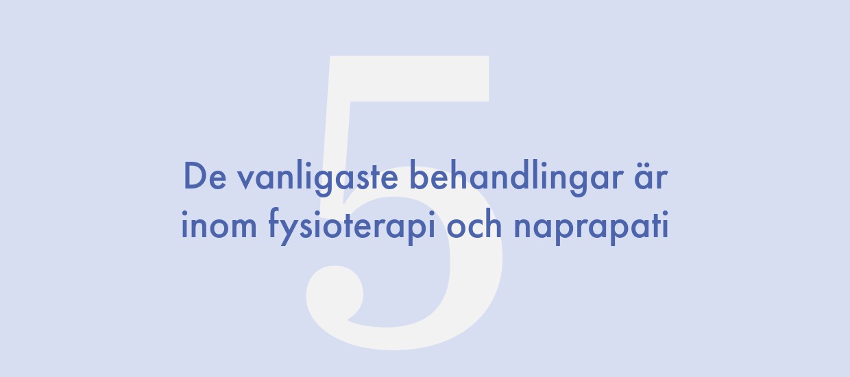 Försäkringen omfattar planerad specialistvård och de vanligaste insatserna är behandlingar av fysioterapeut eller naprapat för till exempel ryggbesvär. Försäkringen omfattar inte akutvård, högintensiv vård, förlossning och liknande.